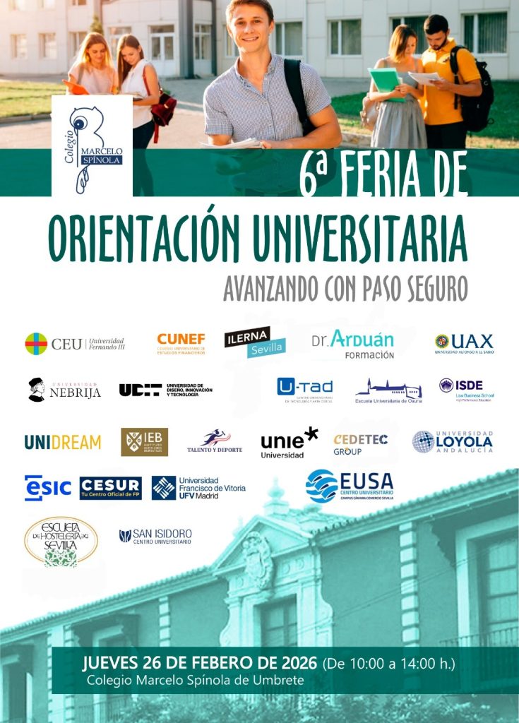 El colegio celebra la VI Feria de Orientación Universitaria El próximo jueves 26 de febrero, el colegio acogerá la VI Feria de Orientación Universitaria, dirigida al alumnado de 1.º y 2.º de Bachillerato, con el objetivo de acompañarlos en la elección de su futuro académico y profesional.